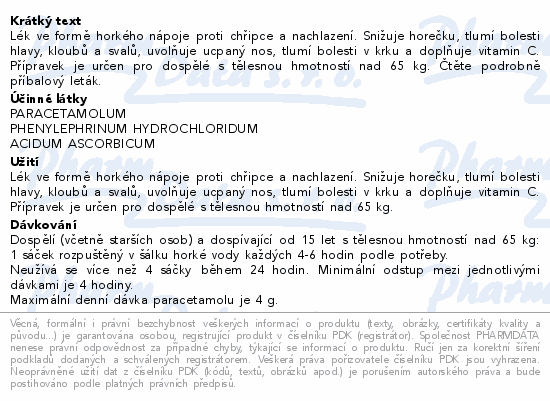 Lék ve formě horkého nápoje proti chřipce a nachlazení. Snižuje horečku, tlumí bolesti hlavy, kloubů a svalů, uvolňuje ucpaný nos, tlumí bolesti v krku a doplňuje vitamin C. Přípravek je určen pro dospělé s tělesnou hmotností nad 65 kg. Čtěte pozorně příbalový leták.