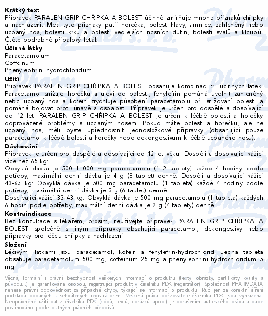 Přípravek PARALEN GRIP CHŘIPKA A BOLEST účinně zmírňuje mnoho příznaků chřipky a nachlazení. Mezi tyto příznaky patří horečka, bolest hlavy, zimnice, zahleněný nebo ucpaný nos, bolesti krku a bolesti vedlejších nosních dutin, bolesti svalů a kloubů. Čtěte pozorně příbalový leták.