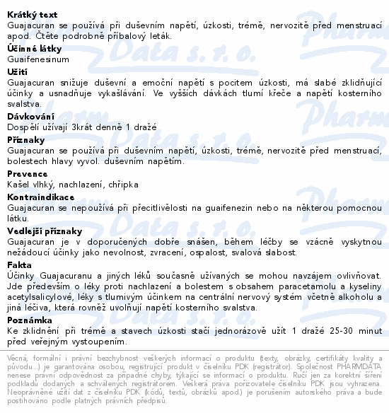 GUAJACURAN je volně prodejný lék obsahující léčivou látku guaifenesin. Používá se především k uvolnění napětí kosterního svalstva (myorelaxační účinek) a ke zmírnění duševního napětí.