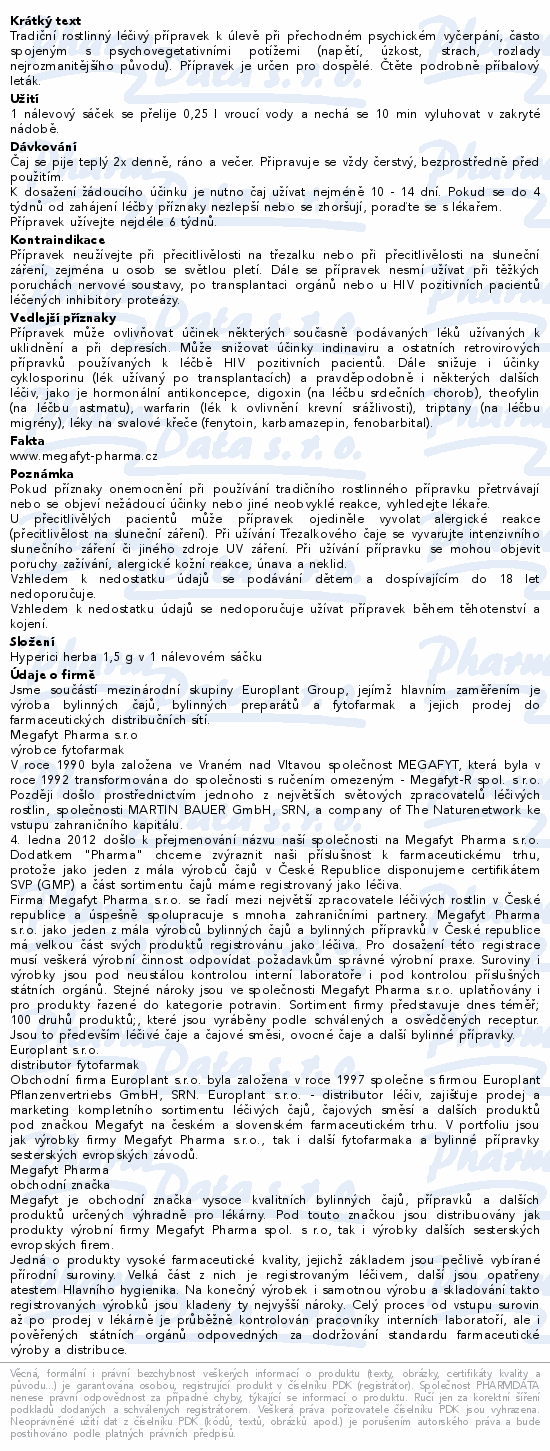 Tradiční rostlinný léčivý přípravek k úlevě při přechodném psychickém vyčerpání, často spojeným s psychovegetativními potížemi (napětí, úzkost, strach, rozlady nejrozmanitějšího původu). Přípravek je určen pro dospělé. Čtěte pozorně příbalový leták.