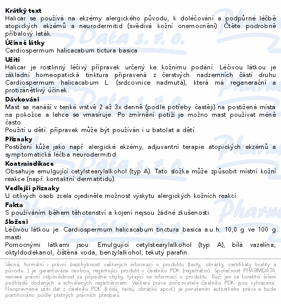 Halicar se používá na ekzémy alergického původu, k doléčování a podpůrné léčbě atopických ekzémů a neurodermitid (svědivá kožní onemocnění). Čtěte pozorně příbalový leták.