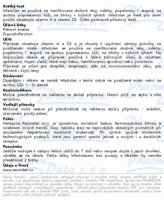 Infadolan se používá na neinfikované drobné rány, oděrky, popáleniny I. stupně, na suchou popraskanou kůži, na trhliny v kožních rýhách. Infadolan je mast pro zevní použití obsahující vitamin A a vitamin D2. Čtěte pozorně příbalový leták.