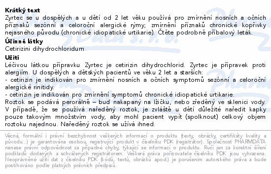 Zyrtec se u dospělých a u dětí od 2 let věku používá pro zmírnění nosních a očních příznaků sezónní a celoroční alergické rýmy; zmírnění příznaků chronické kopřivky nejasného původu (chronické idiopatické urtikarie). Čtěte pozorně příbalový leták.