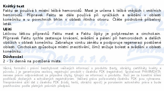 Faktu se používá k místní léčbě hemoroidů. Mast je určena k léčbě vnějších i vnitřních hemoroidů. Přípravek Faktu se dále používá při vyrážkách a svědění v oblasti konečníku a u povrchních trhlin v oblasti řitního otvoru. Čtěte pozorně příbalový leták.