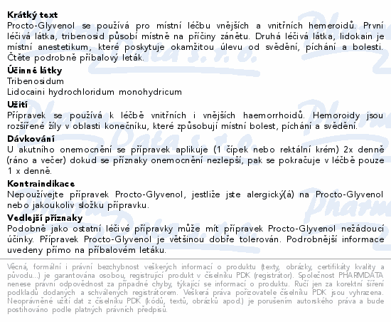 Procto-Glyvenol rektální čípky je léčivý přípravek určený k lokální léčbě vnitřních a vnějších hemoroidů. Hemoroidy jsou rozšířené žíly v oblasti konečníku, které způsobují bolest, píchání a svědění. Procto-Glyvenol obsahuje dvě účinné látky: