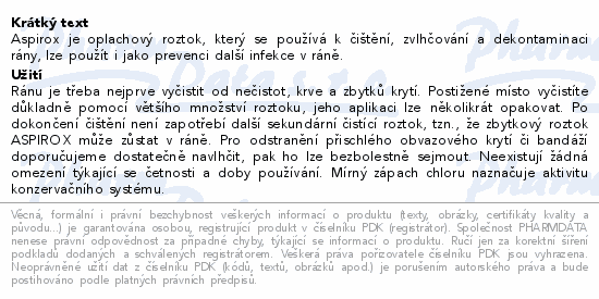 Aspirox je oplachový roztok, který se používá k čištění, zvlhčování a dekontaminaci rány, lze použít i jako prevenci další infekce v ráně.