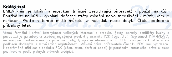 EMLA krém je lokální anestetikum (místně znecitlivující přípravek) k použití na kůži. Používá se na kůži k vyvolání dočasné ztráty vnímání nebo znecitlivění v místě, kam je nanesen. Přesto v tomto místě můžete vnímat tlak nebo dotyk. Čtěte pozorně příbalový leták.