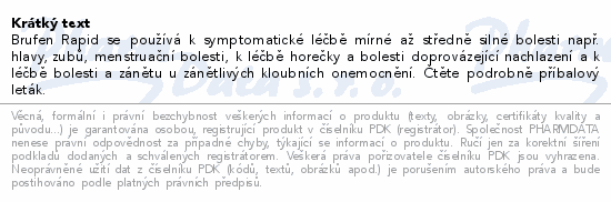 Brufen Rapid se používá k symptomatické léčbě mírné až středně silné bolesti např. hlavy, zubů, menstruační bolesti, k léčbě horečky a bolesti doprovázející nachlazení a k léčbě bolesti a zánětu u zánětlivých kloubních onemocnění. Čtěte pozorně příbalový leták.