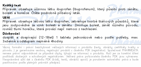 Jako analgetikum antipyretikum se podává obvykle 400 mg ibuprofenu (1 tableta přípravku) 1 až 3krát denně s odstupem mezi jednotlivými dávkami nejméně 4 hodiny.