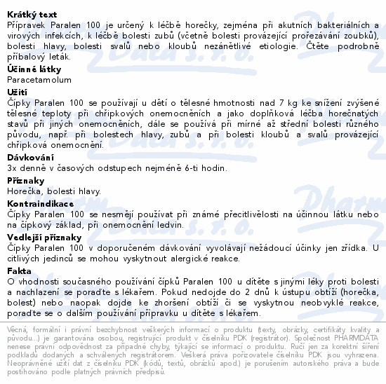 Přípravek Paralen 100 je určený k léčbě horečky, zejména při akutních bakteriálních a virových infekcích, k léčbě bolesti zubů (včetně bolesti provázející prořezávání zoubků), bolesti hlavy, bolesti svalů nebo kloubů nezánětlivé etiologie. Čtěte pozorně příbalový leták.