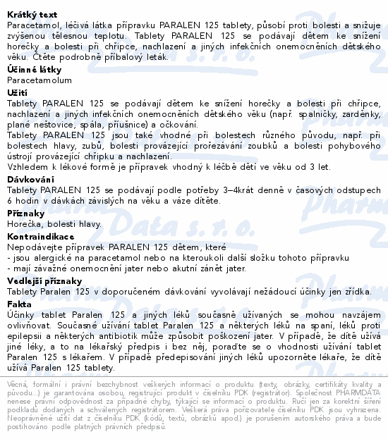 Paracetamol, léčivá látka přípravku PARALEN 125 tablety, působí proti bolesti a snižuje zvýšenou tělesnou teplotu. Tablety PARALEN 125 se podávají dětem ke snížení horečky a bolesti při chřipce, nachlazení a jiných infekčních onemocněních dětského věku. Čtěte pozorně příbalový leták.