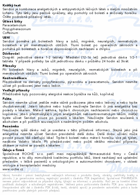 Saridon je kombinace analgetických a antipyretických léčivých látek s malým množstvím kofeinu. Tyto látky jsou pečlivě vyváženy, aby pomohly od bolestí a snižovaly horečku. Čtěte pozorně příbalový leták.