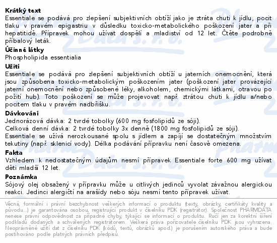 Essentiale se podává pro zlepšení subjektivních obtíží jako je ztráta chuti k jídlu, pocit tlaku v pravém epigastriu v důsledku toxicko-metabolického poškození jater a při hepatitidě. Přípravek mohou užívat dospělí a mladiství od 12 let. Čtěte pozorně příbalový leták.