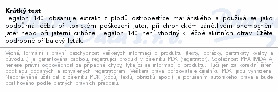 Legalon 140 obsahuje extrakt z plodů ostropestřce mariánského a používá se jako podpůrná léčba při toxickém poškození jater, při chronickém zánětlivém onemocnění jater nebo při jaterní cirhóze. Legalon 140 není vhodný k léčbě akutních otrav. Čtěte pozorně příbalový leták.
