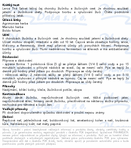 Leros Thé Salvat léčivý čaj choroby žlučníku a žlučových cest. Je vhodnou součástí jaterní a žlučníkové diety. Podporuje tvorbu a vylučování žluči. Čtěte pozorně příbalový leták.