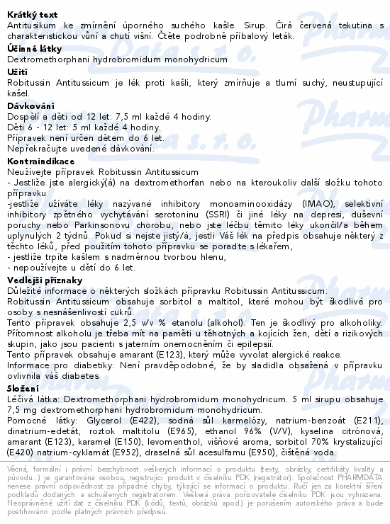 Jestliže kašel přetrvává déle než 7 dní (3 dny u dětí), vrátí se nebo je doprovázen horečkou, vyrážkou či neustupující bolestí hlavy, přestaňte přípravek Robitussin Antitussicum užívat a poraďte se s lékařem. Může se jednat o projevy závažného stavu.