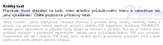 Přípravek tlumí dráždění ke kašli, mění skladbu průduškového hlenu a usnadňuje tak jeho vykašlávání. Čtěte pozorně příbalový leták.