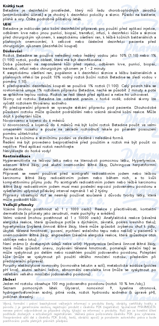 Betadine je dezinfekční prostředek, který ničí řadu choroboplodných zárodků (antimikrobiální účinek) a je vhodný k dezinfekci pokožky a sliznic. Působí na bakterie, plísně a viry. Čtěte pozorně příbalový leták.