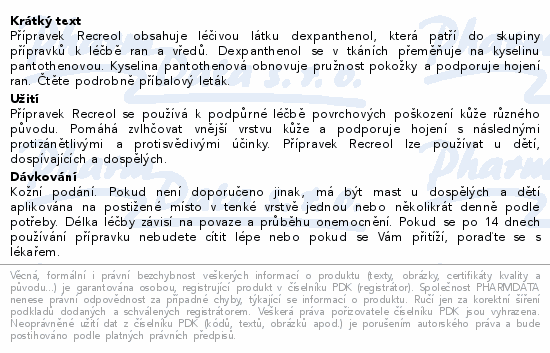 Přípravek Recreol obsahuje léčivou látku dexpanthenol, která patří do skupiny přípravků k léčbě ran a vředů. Dexpanthenol se v tkáních přeměňuje na kyselinu pantothenovou. Kyselina pantothenová obnovuje pružnost pokožky a podporuje hojení ran. Čtěte pozorně příbalový leták.