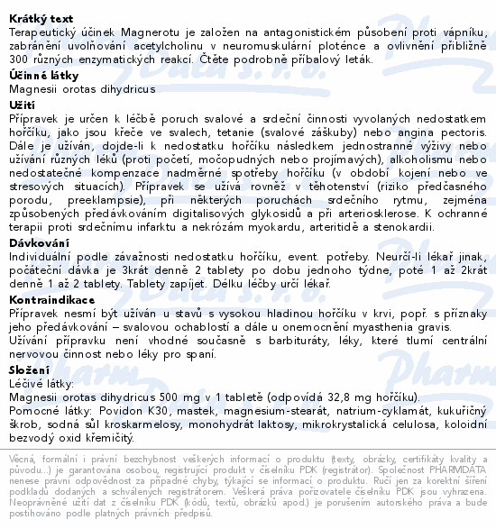 Magnerot je přípravek s obsahem jedinečné kombinace magnesia a kyseliny orotové (magnesium orotát). Používá se při léčbě poruch svalové a srdeční činnosti vyvolaných nedostatkem magnesia, jako jsou křeče ve svalech, tetanie (svalové záškuby) nebo angina pectoris. Užívá se i při nedostatku magnesia následkem jednostranné výživy nebo užívání různých léků, při alkoholismu, při nedostatečné kompenzaci zvýšené potřeby magnesia nebo během těhotenství (při riziku předčasného porodu, preeklampsii). Čtěte pozorně příbalový leták.