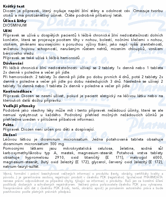 Diozen 500mg je volně prodejný léčivý přípravek určený pro dospělé. Užívá se k léčbě příznaků a projevů chronické žilní insuficience dolních končetin nebo při léčbě akutních atak hemoroidálního onemocnění.