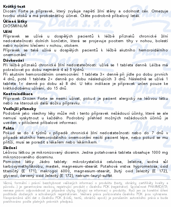 Diozen Forte 1000mg je volně prodejný léčivý přípravek určený pro dospělé. Užívá se k léčbě příznaků a projevů chronické žilní insuficience dolních končetin nebo při léčbě akutních atak hemoroidálního onemocnění. Zvyšuje napětí žilní stěny a odolnost cév. Ulevuje od otoků, bolesti a má protizánětlivý účinek. Čtěte pozorně příbalový leták.