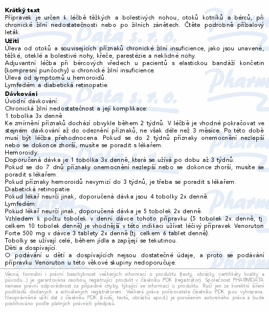 - Žilní insuficience: 1 tobolka 3x denně (900 mg oxerutinu denně), ke zmírnění obtíží dochází obvykle během 2 týdnů. Maximální délka užívání 3 měsíce.