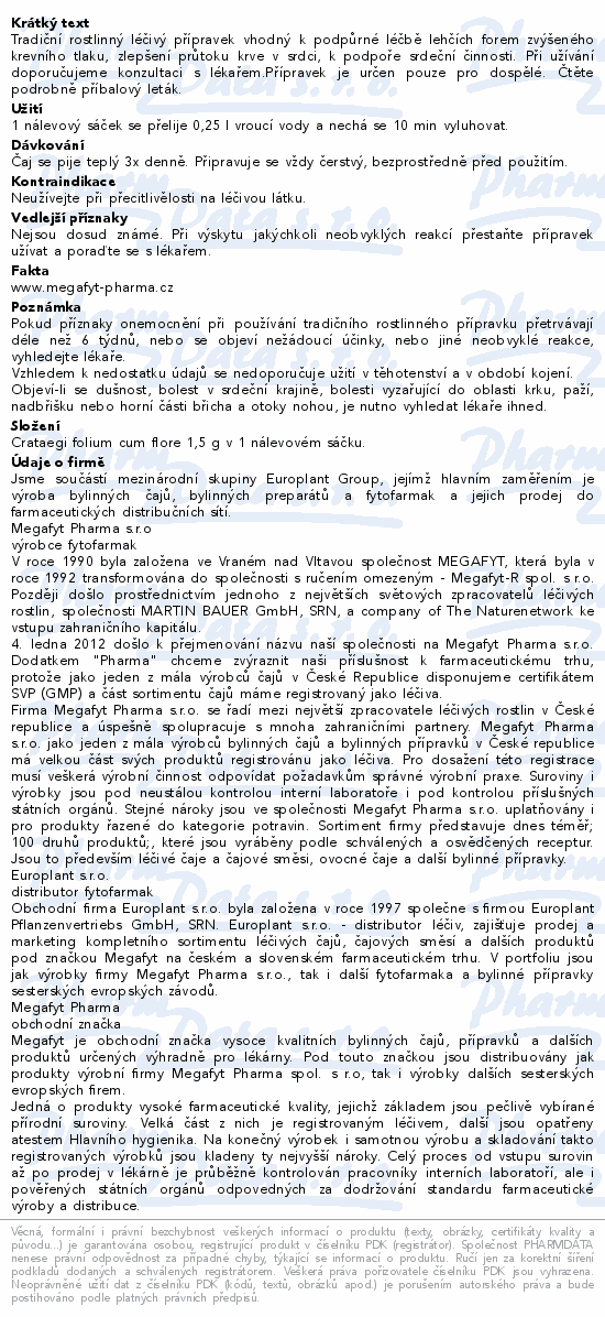 Tradiční rostlinný léčivý přípravek vhodný k podpůrné léčbě lehčích forem zvýšeného krevního tlaku, zlepšení průtoku krve v srdci, k podpoře srdeční činnosti. Při užívání doporučujeme konzultaci s lékařem.Přípravek je určen pouze pro dospělé. Čtěte pozorně příbalový leták.