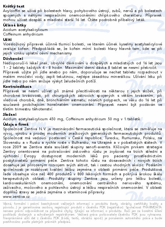 Acylcoffin se užívá při bolestech hlavy, pohybového ústrojí, zubů, nervů a při bolestech spojených s náhlými respiračními onemocněními chřipkového charakteru. Přípravek mohou užívat dospělí a mladiství starší 16 let. Čtěte pozorně příbalový leták.