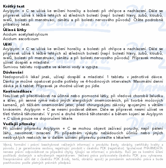 Acylpyrin + C se užívá ke snížení horečky a bolesti při chřipce a nachlazení. Dále se přípravek užívá k léčbě lehkých až středních bolestí (např. bolestí hlavy, zubů, kloubů, svalů, bolesti při menstruaci, zánětu a při bolesti nervového původu). Čtěte pozorně příbalový leták.