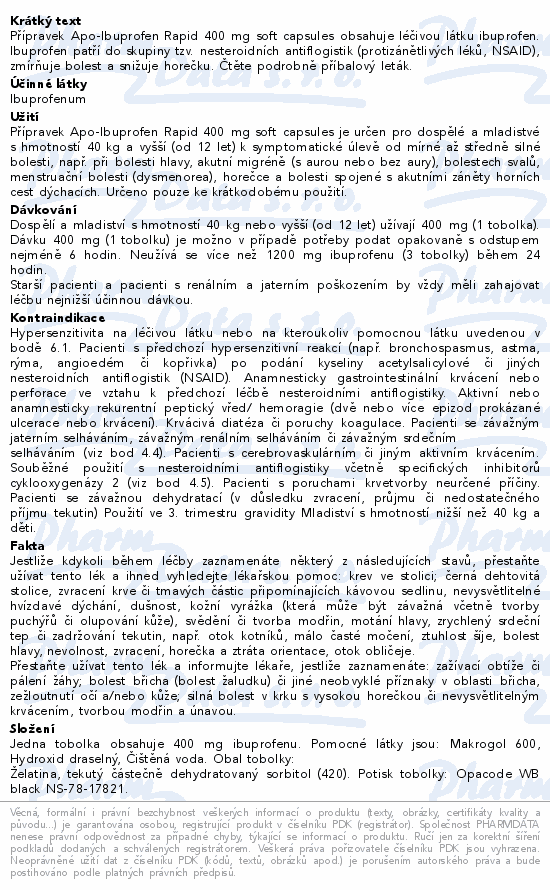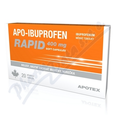 Přípravek Apo-Ibuprofen Rapid 400 mg soft capsules obsahuje léčivou látku ibuprofen. Ibuprofen patří do skupiny tzv. nesteroidních antiflogistik (protizánětlivých léků, NSAID), zmírňuje bolest a snižuje horečku. Čtěte pozorně příbalový leták.