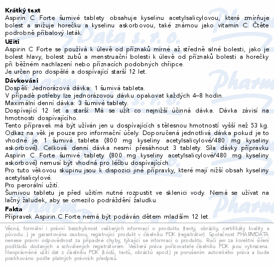 Aspirin C Forte šumivé tablety obsahuje kyselinu acetylsalicylovou, která zmírňuje bolest a snižuje horečku a kyselinu askorbovou, také známou jako vitamin C. Čtěte pozorně příbalový leták.