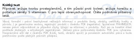 Přípravek snižuje tvorbu prostaglandinů, a tím působí proti bolesti, snižuje horečku a potlačuje záněty. S vitaminem C pro lepší obranyschopnost. Čtěte pozorně příbalový leták.