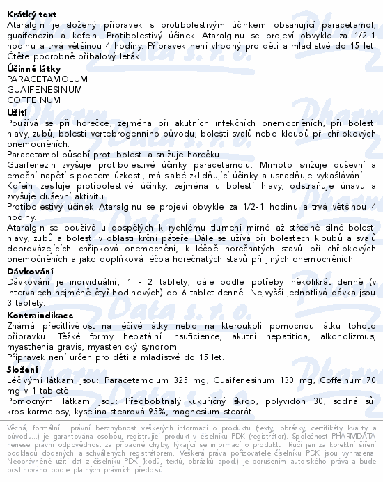 Ataralgin je léčivý přípravek ve formě potahovaných tablet, určený k úlevě od bolesti různého původu. Obsahuje kombinaci účinných látek paracetamol, guaifenesin a kofein. Protibolestivý účinek Ataralginu se projeví obvykle za 1/2-1 hodinu a trvá většinou 4 hodiny
