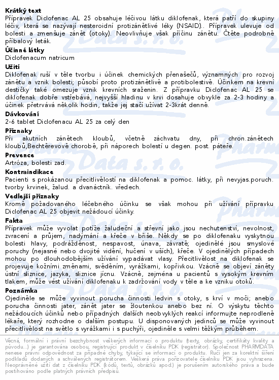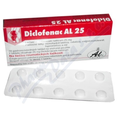 Přípravek Diclofenac AL 25 obsahuje léčivou látku diklofenak, která patří do skupiny léčiv, která se nazývají nesteroidní protizánětlivé léky (NSAID).. Přípravek ulevuje od bolesti a zmenšuje zánět (otoky). Neovlivňuje však příčinu zánětu. Čtěte pozorně příbalový leták.