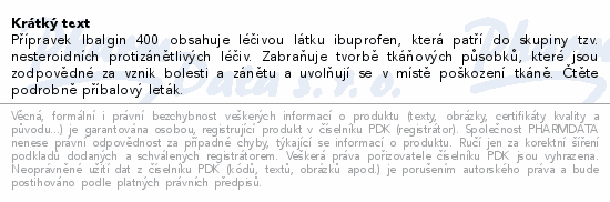 Ibalgin 400 mg je léčivý přípravek s obsahem účinné látky ibuprofen, který patří mezi tzv. nesteroidní protizánětlivé léky (NSAID). Působí proti bolesti, snižuje horečku a má protizánětlivé účinky.