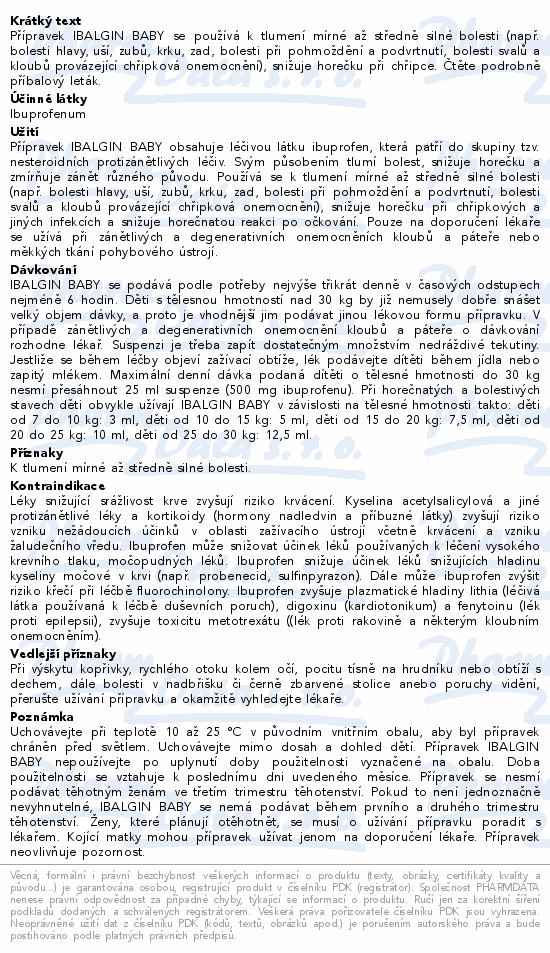Přípravek IBALGIN BABY se používá k tlumení mírné až středně silné bolesti (např. bolesti hlavy, uší, zubů, krku, zad, bolesti při pohmoždění a podvrtnutí, bolesti svalů a kloubů provázející chřipková onemocnění), snižuje horečku při chřipce. Čtěte pozorně příbalový leták.
