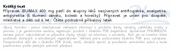Přípravek IBUMAX 400 mg patří do skupiny léků nazývaných antiflogistika, analgetika, antipyretika (k tlumení zánětu, bolesti a horečky). Přípravek je určen pro dospělé, mladistvé a děti od 6 let.. Čtěte pozorně příbalový leták.