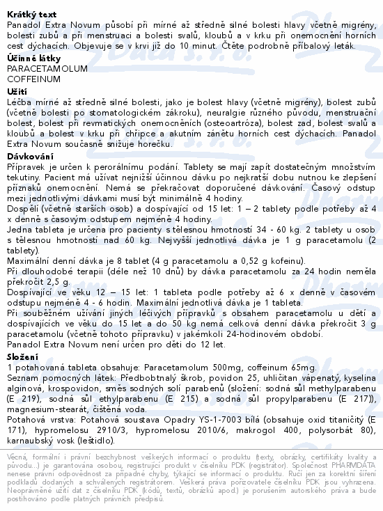 Panadol Extra Novum obsahuje kombinaci dvou léčivých látek, která je účinná proti bolesti a horečce: paracetamol a kofein. Paracetamol zajišťuje úlevu od bolesti a snižuje zvýšenou tělesnou teplotu. Kofein zvyšuje analgetický účinek paracetamolu, zmírňuje únavu, mírně podporuje dýchání a krevní oběh u horečnatých onemocnění. Potahované tablety Panadol Extra Novum jsou vhodné k úlevě: Při bolesti hlavy, migréně. Bolesti zad, zubů. Bolesti při menstruaci. Panadol Extra Novum též přináší úlevu od nepříjemných příznaků chřipky a nachlazení, jako jsou bolesti svalů, kloubů a bolest v krku, a snižuje horečku. Po poradě s lékařem se přípravek může užívat k potlačení bolesti při revmatických onemocněních, jako je artróza (degenerativní kloubní onemocnění), a při neuralgii (bolest pociťovaná v průběhu nervu). Přípravek je určen pro dospělé a dospívající od 12 let.