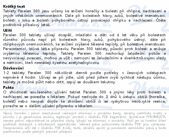 Paralen 500 mg je léčivý přípravek určený k úlevě od bolesti a ke snižování horečky. Obsahuje léčivou látku paracetamol, která patří mezi analgetika a antipyretika. Tablety jsou vhodné při bolestech hlavy, zubů, zad, při menstruačních bolestech nebo při bolesti pohybového ústrojí provázející chřipku a nachlazení.