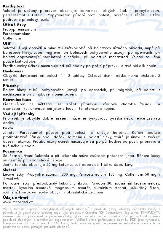 Valetol je složený přípravek obsahující kombinaci léčivých látek – propyfenazon, paracetamol a kofein. Propyfenazon působí proti bolesti, horečce a zánětu. Čtěte pozorně příbalový leták.