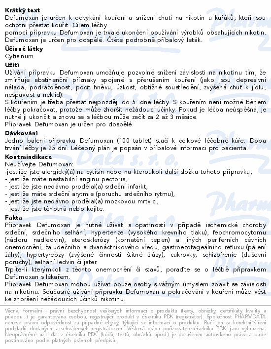 Defumoxan je určen k odvykání kouření a snížení chuti na nikotin u kuřáků, kteří jsou ochotni přestat kouřit. Cílem léčby pomocí přípravku Defumoxan je trvalé ukončení používání výrobků obsahujících nikotin. Defumoxan je určen pro dospělé. Čtěte pozorně příbalový leták.