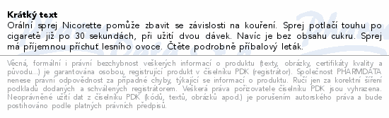 Orální sprej Nicorette pomůže zbavit se závislosti na kouření. Sprej potlačí touhu po cigaretě již po 30 sekundách, při užití dvou dávek. Navíc je bez obsahu cukru. Sprej má příjemnou příchuť lesního ovoce,. Čtěte pozorně příbalový leták.