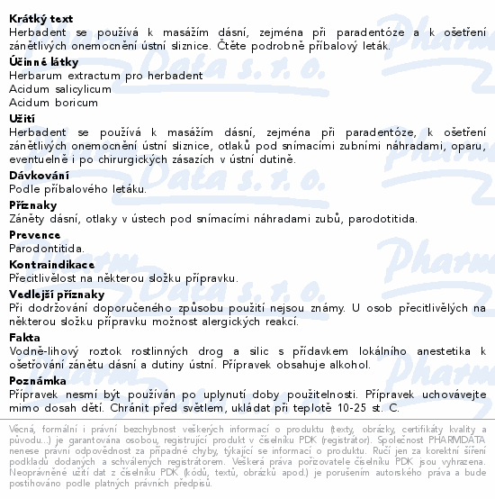 Herbadent se používá k masážím dásní, zejména při paradentóze a k ošetření zánětlivých onemocnění ústní sliznice. Čtěte pozorně příbalový leták.