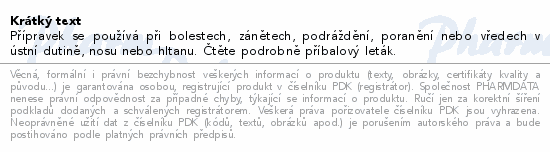 Přípravek se používá při bolestech, zánětech, podráždění, poranění nebo vředech v ústní dutině, nosu nebo hltanu. Čtěte pozorně příbalový leták.