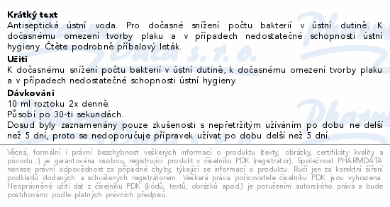 Antiseptická ústní voda. Pro dočasné snížení počtu bakterií v ústní dutině. K dočasnému omezení tvorby plaku a v případech nedostatečné schopnosti ústní hygieny. Čtěte pozorně příbalový leták.