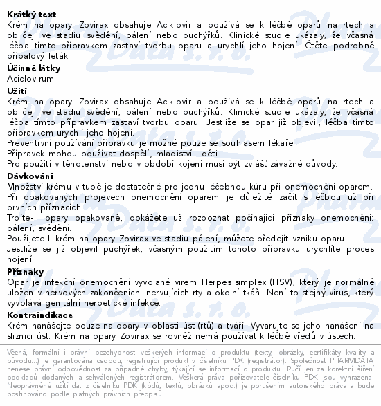 Zovirax krém je určen k místní léčbě projevů způsobených virem herpes simplex, zejména oparů na rtech a v jejich okolí. Obsahuje účinnou látku aciklovir, která patří mezi antivirotika – působí proti virům tím, že narušuje jejich množení v postižených buňkách.