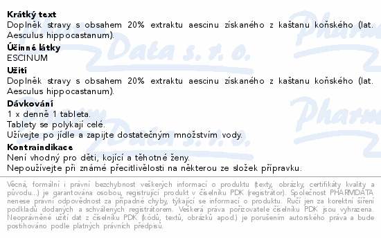 Doplněk stravy s obsahem 20% extraktu aescinu získaného z kaštanu koňského (lat. Aesculus hippocastanum).