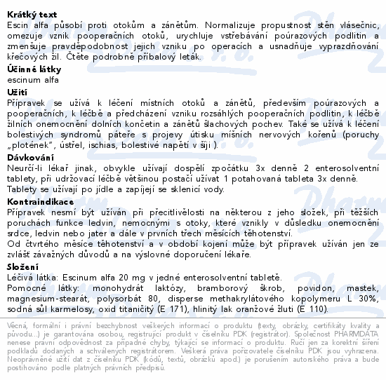 Aescin-Teva 20 mg je léčivý přípravek ve formě potahovaných tablet, který obsahuje účinnou látku aescin, extrakt z jírovce maďalu (kaštanu). Aescin se tradičně používá k podpoře normální funkce žil a kapilár, pomáhá zmírnit otoky a pocit těžkých, unavených nohou způsobených chronickou žilní nedostatečností.