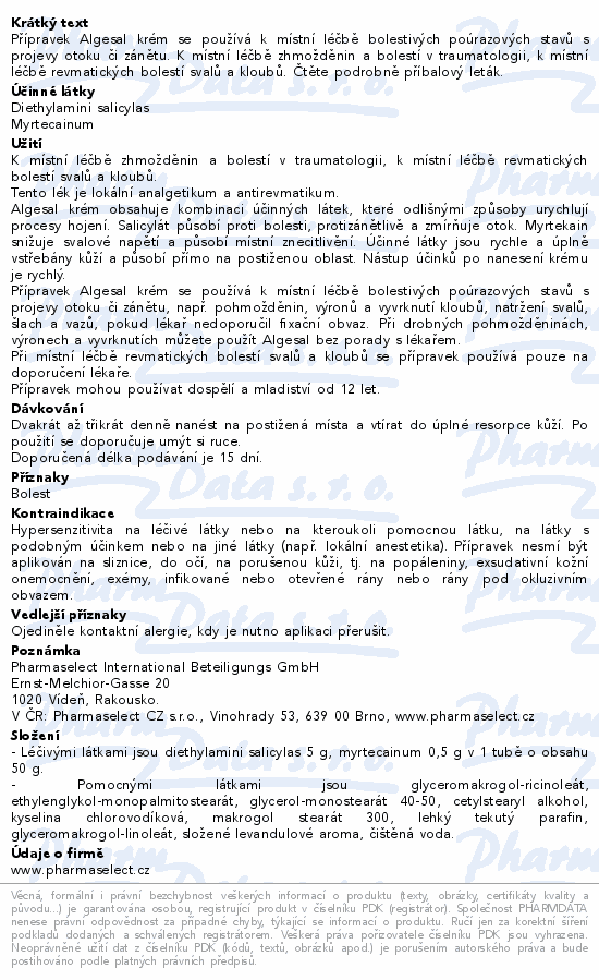 Přípravek Algesal krém se používá k místní léčbě bolestivých poúrazových stavů s projevy otoku či zánětu. K místní léčbě zhmožděnin a bolestí v traumatologii, k místní léčbě revmatických bolestí svalů a kloubů. Čtěte pozorně příbalový leták.